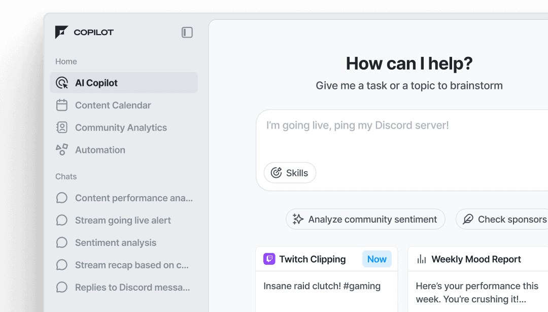 FanBase comes with a built-in AI copilot that monitors your community across Discord, Twitch, X, and more. It surfaces insights, flags what matters, and suggests content and campaigns based on what's actually happening with your fans. Less time managing, more time building your brand.